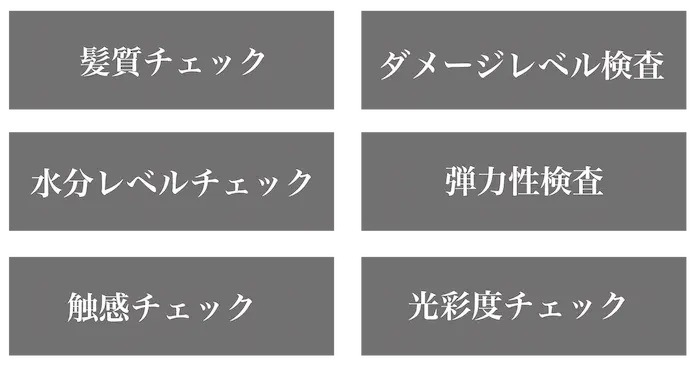 現在の髪の状態を正しく把握させていただくため、目で見て分からない細かな部分の情報もお伺いします。一人ひとりの髪のコンディションを診断し、ダメージなどのトラブルを解決して美しい“素材”を創ります。