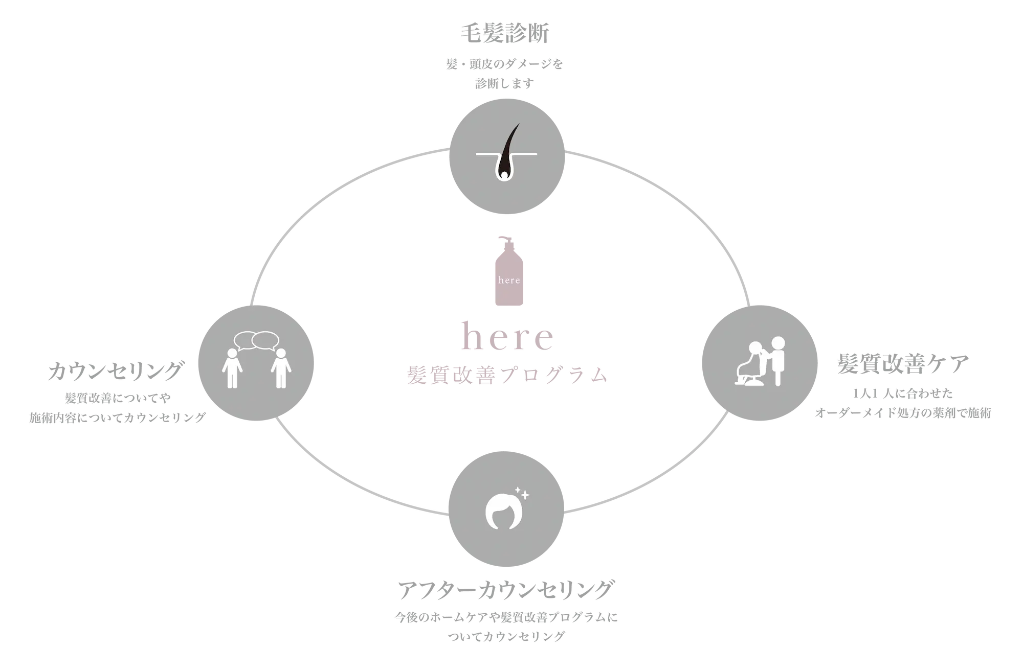 ダメージを限りなくなくすため、here では全ての施術に髪質改善トリートメントを使用。あなたの髪のダメージの原因や不足している栄養を見極め、 オーダーメイドで薬剤を調合します。 弾力、やわらかさ、保湿・保水、保護バリア、アルカリ除去など、あなたの髪に必要な栄養素をしっかりと入れ込み、髪を修復していきます。